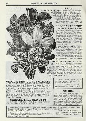 | Keywords: Lippincott seeds (16185743068).jpg  10 <br> MISS C H LIPPINCOTT <br> BEAN <br> SCARLET RUNNER ” A Favorite Old-fashiou- <br> ed Climber One of the very few <br> beans that are both ornamental <br> and useful It grows rapidly to <br> a height of 10 to 12 feet and is <br> covered from July until heavy <br> frost with clusters of beauti- <br> ful scarlet flowers Pkt 12 <br> seeds 5c ; pt 20c ; qt 30c <br> CHRYSANTHEMUM <br> FRENCH MARGUERITES <br> Annual variety much grown <br> for cut flowers The plants <br> grow 12 to 18 inches high and <br> produce on long stems beau- <br> tiful large flowers of many <br> bright colors They flower all <br> summer in the garden and <br> make elegant pot plants for <br> vinter flowering Fkt 200 <br> ˘eeds 5 cts <br> INODORU-M PLENISSIM- <br> tT I ” Although a perennial it <br> flowers abundantly the first <br> year from seed each plant <br> producing hundreds of beau- <br> tiful perfectly double snow- <br> white flowers unsurpassed for <br> boquets It remains in bloom <br> all summer Pkt 200 seeds <br> 5 cts <br> FANCY PERENNIAL ” From the <br> best Incurved Pompone Japanese <br> Chinese and Anemone-flowered vari- <br> eties Seed sown in the hotbed in <br> February or March or even April will <br> give plants that bloom in August or <br> September and cannot fail with proper <br> care to give magnificent flowers in a <br> wonderful variety of colors and forms <br> Pkt 200 seeds 10 cts <br> CROZY S NEW DWARF CANNAS <br> One of the most popular of bedding plants <br> while even single specimens are most attractive <br> in the garden They will bloom the first year <br> from seed if you soak them in boiling water over <br> night; sow singly in small pots as soon as con- <br> venient and grow as rapidly as possible The <br> roots can be kept in the cellar over winter and <br> each clump will give six to eight good roots for <br> planting out the following spring Pkt 15 seeds <br> 5 cts ; oz 25 cts <br> CANNAS TALL OLD TYPE <br> A mixture of all the best tall growing varieties <br> Pkt 15 seeds 5 cts ; oz 25 cts <br> I have used your seeds <br> several years and am very <br> pleased with them <br> ” Helen E Fisher <br> Thompsonville Conn 4-4-'15 <br> COLEUS <br> One of the best known and <br> most universally admired orna- <br> mental foliage plants in an end- <br> less variety of colors and shad- <br> ings indispensable for ribbon <br> and carpet bedding or as single <br> specimens Coleus seed germin- <br> ates easily Pkt 200 seeds 5 cts <br> Have used your seeds for the last several years and found them the best Your <br> Tomato seed last year grew fruit that weighed over one pound <br> Maceo Ky Feb 27 1915 ”Mr Richard Brown <br> Your seeds 'have satisfied me more than those bought elsewhere I thank you <br> for sending me your latest catalogue ”Mrs Harriet B Diehl <br> Ceres Cal May 6 191 42205418 132981 65968 Page 10 Text http //www biodiversitylibrary org/page/42205418 1915 Henry G Gilbert Nursery and Seed Trade Catalog Collection ; Miss C H Lippincott Firm NameFound Chrysanthemum NameConfirmed Chrysanthemum EOLID 38388 NameBankID 2657422 NameFound Maceo NameConfirmed Maceo NameBankID 4228442 Biodiversity Heritage Library Lippincott seeds 1916 Garden Stories Catalogs Flowers Fruit Nurseries Horticulture Seeds Vegetables U S Department of Agriculture National Agricultural Library bhl page 42205418 dc identifier http //biodiversitylibrary org/page/42205418 bhlGardenStories BHLinbloom nurseries horticulture u s department of agriculture national agricultural library bhlgardenstories bhlinbloom Information field Flickr posted date ISOdate 2015-01-26 Check categories 2015 August 25 CC-BY-2 0 BioDivLibrary https //flickr com/photos/61021753 N02/16185743068 2015-08-25 05 53 11 cc-by-2 0 PD-old-70-1923 Lippincott seeds Photos uploaded from Flickr by Fæ using a script |