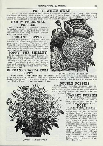Keywords: Lippincott seeds (16185785378).jpg MINNEAPOLIS MINN <br> POPPY WHITE SWAN <br> One of the most effective and valuable Poppies introduced for years The plants <br> are about 18 inches high grow in very pretty bush form crowned with flowers of <br> enormous size perfect form very double and of the purest snow-white Its flowering <br> period is considerablv longer than that of other Poppies put oยป/ _ _ Js 3_cts <br> HARDY PERENNIAL <br> POPPIES <br> ORIENTAL A charming summer <br> flowering plant producing numerous <br> leafy stems about 2I/2 feet high which <br> are covered with deep crimson flowers <br> Pkt 150 seeds 5 cts <br> ICELAND POPPIES <br> These fine perennial poppies produce <br> flowers in great abundance the tirst <br> year from the seed The colors range <br> from the purest white and yellow to <br> the deepest glowing orange-scarlet and <br> have a delicious fragrance Mixed colors <br> Pkt 200 seeds 5 cts <br> POPPY THE SHIRLEY <br> It is perfectly hardy and flowers th <br> first year from seed The flowers are <br> large exceedingly graceful and elegant; <br> the colors are pure soft and varied and <br> range from blush white rose delicate <br> pink and carmine through innumerable <br> tints to bright sparkling crimson Pkt <br> 300 seeds 5 cts <br> BURBANKS SANTA ROSA <br> POPPY POPPY DOUBLE MIXED <br> NEW STRAIN OF SHIRLEY POPPIES This new strain is a mixture which is <br> made up carefully so that there is a proper blending of the colors; some of the <br> darker shades nearly approach blue or bluish purple a color heretofore unknown in <br> the Shirley Poppy Pkt 300 set d 5 cts <br> DOUBLE POPPIES <br> MIXED For dazzling richness and va- <br> riety of colors the flowers are unequalled <br> Simply scatter the seeds in the open ground <br> and a mass of beauty will result Pkt 300 <br> seeds 5 cts <br> SCARLET POPPIES <br> TULIP Large vivid scar- <br> let blossoms which have a <br> dark spot at the base of the <br> petal Pkt 300 seeds 5 cts <br> ROSE <br> 3IULTIFLORA T R U E <br> With seed of these Roses <br> plants may be had in bloom <br> in sixty days from the time <br> of sowing Plant at any time <br> They grow quickly and flow- <br> ers appear in large clusters <br> and in SHch quantity that a <br> plant looks like a boquet <br> Perfectlj- hardy in the garden <br> where they bloom all summer <br> In pots they bloom both <br> summer and winter From a <br> packet of seeds one will get <br> roses of various colors white <br> pink crimson etc No two <br> alike and mostly perfectly <br> double and very sweet Pkt <br> 30 seeds 10 cts <br> JIOSE MULTIFLORA 42205439 132981 65968 Page 31 Text http //www biodiversitylibrary org/page/42205439 1915 Henry G Gilbert Nursery and Seed Trade Catalog Collection ; Miss C H Lippincott Firm Biodiversity Heritage Library Lippincott seeds 1916 Garden Stories Catalogs Flowers Fruit Nurseries Horticulture Seeds Vegetables U S Department of Agriculture National Agricultural Library bhl page 42205439 dc identifier http //biodiversitylibrary org/page/42205439 bhlGardenStories BHLinbloom nurseries horticulture u s department of agriculture national agricultural library bhlgardenstories bhlinbloom Information field Flickr posted date ISOdate 2015-01-26 Check categories 2015 August 25 CC-BY-2 0 BioDivLibrary https //flickr com/photos/61021753 N02/16185785378 2015-08-25 05 50 49 cc-by-2 0 PD-old-70-1923 Lippincott seeds Photos uploaded from Flickr by Fรฆ using a script |