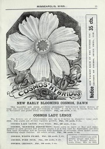 Keywords: Lippincott seeds (16186009280).jpg MINNEAPOLIS MINN <br> NEW EARLY BLOOMING COSMOS DAWN <br> This beautiful new strain produces abundantly well-formed lovely flowers of <br> large size; pure white pink and crimson in color It can be had in bloom from July <br> to November and grows freely everywhere Pkt 100 seeds 5 ots <br> COSMOS LADY LENOX <br> The flowers are of extraordinary size up to 6 inches in diameter; color shell- <br> pink The plants are of very vigorous growth Pkt 100 seeds 8 cts <br> COSMOS LADY LENOX ” Pure White Pkt 100 seeds 8 cts <br> COSMOS MAMMOTH PERFECTION ” Seeds sown in April or May and trans- <br> planted to open ground will produce plants 5 or 6 feet high by September and from <br> then until November will be covered with hundreds of blossoms three inches across <br> resembling single Dahlias All colors mixed Pkt 100 seeds 5 cts <br> COS3IOS WHITE PEARE Pkt 100 seeds 5 cts <br> COSMOS PURE PINK Pkt 100 seeds 5 cts <br> COSMOS CRIMSON Pkt 100 seeds 5 cts <br> Always found your seeds <br> simply grand and true ” <br> Mrs N J Temple Millers- <br> town Penu Mar IS 1915 42205423 132981 65968 Page 15 Text http //www biodiversitylibrary org/page/42205423 1915 Henry G Gilbert Nursery and Seed Trade Catalog Collection ; Miss C H Lippincott Firm Biodiversity Heritage Library Lippincott seeds 1916 Garden Stories Catalogs Flowers Fruit Nurseries Horticulture Seeds Vegetables U S Department of Agriculture National Agricultural Library bhl page 42205423 dc identifier http //biodiversitylibrary org/page/42205423 bhlGardenStories BHLinbloom nurseries horticulture u s department of agriculture national agricultural library bhlgardenstories bhlinbloom Information field Flickr posted date ISOdate 2015-01-26 Check categories 2015 August 25 CC-BY-2 0 BioDivLibrary https //flickr com/photos/61021753 N02/16186009280 2015-08-25 05 52 19 cc-by-2 0 PD-old-70-1923 Lippincott seeds Photos uploaded from Flickr by Fæ using a script