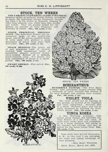 | Keywords: Lippincott seeds (16187206049).jpg 34 <br> MISS C H LIPPINCOTT <br> STOCK TEN WEEKS <br> THE LARGEST FLOWERING GLOBE PYRAMIDAL <br> Immense spikes of perfectly double flowers pyramidal <br> in shape the individual blooms frequently measur- <br> ing from 2 to 2 2 inches in diameter ranging in <br> color from crimson rose white blue lilac brown ˘- <br> and yellow They are greatly prized for cut 5 <br> flowers on account of their fragxance and j - <br> diversity of colors Pkt 100 seeds 5 cts - <br> WHITE PERPETUAL PRINCESS <br> ALICE ” The individual flowers are un <br> commonly large of fine rosette like <br> shape and of the purest possible white <br> If sown early will produce u great <br> abundance of bloom from June until <br> November Pkt 100 seeds 5 cts <br> PEACH BLOSSOM ” The plants are <br> of neat pyramidal habit of growth <br> crowded with magnificent heads of <br> beautifully shaped perfectly double <br> sweet-scented flowers of a delicate <br> peach-blossom color For beauty and \ <br> long continuance of bloom it is unsur- <br> passed Pkt 100 seeds 5 cts <br> DWARF GERJWAN ” Fine mix <br> 100 seeds 6 cts <br> Pkt <br> STOCK TEN WEEKS <br> SCHIZANTHUS <br> BUTTERFLY FLOWER ” The Poor Man's <br> Orchid neat pyramidal bushes covered with <br> a multitude of small butterfly-like flowers of <br> the most brilliant and striking color designs <br> Pkt 500 seeds 5 cts <br> VIOLET VIOLA <br> The violet should not be wanting in <br> ny garden on account of its fragrance <br> and early appearance Succeeds best <br> n a shady sheltered place and can be <br> easily increased by dividing the roots <br> Finest mixed Pkt 150 seeds 5 cts <br> VINCA ROSEA <br> A free flowering perennial with <br> glossy green foliage and beautiful cir- <br> cular flowers of a fine rose color If <br> sown early under glass and transplant- <br> ed in a warm situation will bloom in <br> the summer and autumn and may be <br> potted for the house before frost Pkt <br> 100 seeds 5 cts <br> SCHIZANTHUS <br> Your seeds have proved thoiKselves <br> O K so this year I am enlarging <br> the order and taking advantage of <br> your premium <br> ”Miss Mabel Thornton <br> Shaw Kans March 3rd 1915 42205442 132981 65968 Page 34 Text http //www biodiversitylibrary org/page/42205442 1915 Henry G Gilbert Nursery and Seed Trade Catalog Collection ; Miss C H Lippincott Firm NameFound Orchid NameFound Schizanthus NameConfirmed Schizanthus aff pinnatus Reeves 24 EOLID 11884489 NameFound Vinca rosea NameConfirmed Vinca rosea EOLID 581125 NameBankID 2775716 Biodiversity Heritage Library Lippincott seeds 1916 Garden Stories Catalogs Flowers Fruit Nurseries Horticulture Seeds Vegetables U S Department of Agriculture National Agricultural Library bhl page 42205442 dc identifier http //biodiversitylibrary org/page/42205442 bhlGardenStories BHLinbloom nurseries horticulture u s department of agriculture national agricultural library bhlgardenstories bhlinbloom Information field Flickr posted date ISOdate 2015-01-26 Check categories 2015 August 25 CC-BY-2 0 BioDivLibrary https //flickr com/photos/61021753 N02/16187206049 2015-08-25 05 56 47 cc-by-2 0 PD-old-70-1923 Lippincott seeds Photos uploaded from Flickr by Fæ using a script |