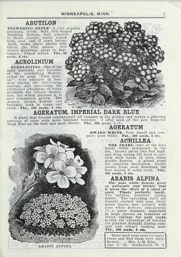| Keywords: Lippincott seeds (16187489117).jpg MINNEAPOLIS MINN <br> ABUTILON <br> FLOWERING MAPLE A \ei popular <br> Dereunial shrub with bell shaped <br> drooping flowers well adapted <br> to house culture easily raided <br> from seed and if sown before <br> April under glass plants will <br> bloom the first season For <br> winter flowering plant in Sep- <br> tember Finest mixed Pkt 30 <br> seeds 8 cts <br> ACROLINIUM <br> EVERLASTING One of the <br> most beautiful and valuable <br> of the everlasting flower <br> called by some Pink Dais <br> ies ; very effective in bor- <br> ders during the blo - ' 'uin <br> seasons and possessing the <br> additional advantage of being <br> available for winter decora- <br> tion for which purpose it is <br> now extensively grown The <br> densely double flowers are <br> faultless both in shape and <br> color Pkt 100 seeds 4 ots <br> AGERATUM IMPERIAL DARK BLUE <br> A plant that blooms continuously all summer in the garden and makes a <br> contrast of color with more brilliant varieties I offer seed of the new <br> Dark Blue as the best and most showy Pkt 300 seeds 5 n <br> AGERATUM <br> pleasing <br> Imperial <br> DWARF WHITE Very dwarf and com-- <br> pact; pure white Pkt 300 seeds 5 cts <br> ACHILLEA <br> THE PEARL One of the best <br> hardy white perennials in the <br> list Grow s about two feet high <br> and from spring till frost is cov- <br> ered with heads of pure white <br> double flowers A grand plant <br> for cemetery decoration Easily <br> srrown from seed flowering the <br> first season if sown early Pkt <br> 300 seeds 5 cts <br> ARABIS ALPINA <br> The pure white flowers grow <br> so uniformly and thickly that <br> it gives the effect of a sheet of <br> snow Plants perfectly hardy <br> The earliest prettiest spring <br> flower The spreading tufts are <br> densely clothed with neat lively <br> green leaves and covered with <br> pure white flowers; conspicuous <br> at a great distance especially <br> in large masses on rockeries or <br> broad edgings for park roads <br> having the advantage of braving <br> the greatest drought during sum- <br> mer and always looking neat <br> Pkt 400 seeds 5 cts <br> ARABIS ALPINA <br> HaA'e used your seed for many <br> years and find them very satis- <br> factory Mrs A M King <br> Apr 1 '15 Rutherford N 1 42205411 132981 65968 Page 3 Text http //www biodiversitylibrary org/page/42205411 1915 Henry G Gilbert Nursery and Seed Trade Catalog Collection ; Miss C H Lippincott Firm NameFound Abutilon NameConfirmed Abutilon hybrid EOLID 71367 NameFound ACHILLEA NameConfirmed Achillea EOLID 36945 NameBankID 2657276 NameFound Ageratum NameConfirmed Ageratum L EOLID 59467 NameFound Arabis alpina NameConfirmed Arabis alpina EOLID 584157 NameBankID 2648388 Biodiversity Heritage Library Lippincott seeds 1916 Garden Stories Catalogs Flowers Fruit Nurseries Horticulture Seeds Vegetables U S Department of Agriculture National Agricultural Library bhl page 42205411 dc identifier http //biodiversitylibrary org/page/42205411 bhlGardenStories BHLinbloom nurseries horticulture u s department of agriculture national agricultural library bhlgardenstories bhlinbloom Information field Flickr posted date ISOdate 2015-01-26 Check categories 2015 August 25 CC-BY-2 0 BioDivLibrary https //flickr com/photos/61021753 N02/16187489117 2015-08-25 05 53 12 cc-by-2 0 PD-old-70-1923 Lippincott seeds Photos uploaded from Flickr by FĂŚ using a script |