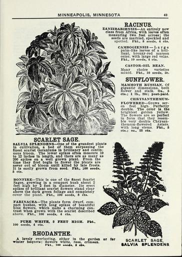 | Keywords: Lippincott seeds (16347264216).jpg MINNEAPOLIS MINNESOTA <br> 43 <br> RACINUS <br> ZANZIBABIENSIS ” An entirely new <br> class from Africa with leaves often <br> measuring two feet across the <br> seeds are marbled speckled and <br> spotted Fkt 8 seeds 4 cts <br> CAMBOGIENSIS ” Large <br> palm-like leaves of a bril- <br> liant bronzy-red maroon <br> color with large red veins <br> Pkt 10 seeds 4 cts <br> CASTOR-OIL BEAN <br> Many choice varieties <br> mixed Pkt 10 seeds 3c <br> SUNFLOWER <br> MAMMOTH RUSSIAN Of <br> gigantic dimensions both <br> flower and stalk Ox 5 <br> cts ; 1 lb 20c; post-paid <br> CHRYSANTHEMUM- <br> FliOWERED ” Grows sev- <br> en feet high Perfectly <br> double The color is the <br> brightest golden yellow <br> The flowers are so perfect <br> in form that they resem- <br> ble very double Chrysan- <br> themum-flowered Asters <br> with long stems Pkt 6 <br> cts ; oz 25 cts <br> SCARLET SAGE <br> SALVIA SPLENDENS ” One of the grandest plants <br> in cultivation a bed of them surpassing the <br> finest scarlet Geraniums in brilliancy and contin- <br> uous bloom The lower spikes often measure 10 <br> to 12 inches in length and there are as many as <br> 200 spikes on a well grown plant Prom the <br> time they first begin to flower the plants are <br> never out of bloom until killed by late frosts <br> It is easily grown from seed Pkt HOG seeds <br> 6 cts <br> BONFIRE ” This is one of the finest Scarlet <br> Sages growing in a compact bush about 2 <br> feet high by 2 feet in diameter Its erect <br> spikes of brilliant scarlet flowers stand clear <br> above the dark green foliage and completely <br> cover the plant Pkt 100 seeds 8 cts <br> FARINACEA ” The plants form dwarf com- <br> pact bushes with long spikes of beautiful <br> blue flowers which make a charming con- <br> trast when grown with the scarlet described <br> above Pkt 100 seeds 4 cts <br> PURE WHITE 2 FEET HIGH Pkt <br> 100 seeds 4 cts <br> RHODANTHE <br> A lovely everlasting either in the garden ©r S©r <br> winter boquets flowers white rose crimson <br> Pkt 100 H« edfi 8 ot« <br> SCARLET SAGE <br> ¢ALVIA tPLENDENS 42162013 132824 65968 Page 43 Text http //www biodiversitylibrary org/page/42162013 1915 Henry G Gilbert Nursery and Seed Trade Catalog Collection ; Miss C H Lippincott Firm NameFound Chrysanthemum NameConfirmed Chrysanthemum EOLID 38388 NameBankID 2657422 NameFound Rhodanthe NameConfirmed Rhodanthe EOLID 2918025 NameBankID 1674221 NameFound Rhodanthe NameConfirmed Rhodanthe EOLID 2918025 NameBankID 4894040 NameFound Salvia splendens NameConfirmed Salvia splendens EOLID 579412 NameBankID 2655330 Biodiversity Heritage Library Lippincott seeds 1915 Garden Stories Catalogs Flowers Fruit Nurseries Horticulture Seeds Vegetables U S Department of Agriculture National Agricultural Library bhl page 42162013 dc identifier http //biodiversitylibrary org/page/42162013 bhlGardenStories BHLinbloom nurseries horticulture u s department of agriculture national agricultural library bhlgardenstories bhlinbloom Information field Flickr posted date ISOdate 2015-01-26 Check categories 2015 August 25 CC-BY-2 0 BioDivLibrary https //flickr com/photos/61021753 N02/16347264216 2015-08-25 05 51 06 cc-by-2 0 PD-old-70-1923 Lippincott seeds Photos uploaded from Flickr by Fæ using a script |