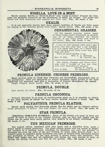 | Keywords: Lippincott seeds (16372339652).jpg MINNEAPOLIS MINNESOTA <br> 39 <br> NIGELLA LOVE-IN-A-MIST <br> Hardy annual known as Devil-in-Bush and Lady-in-Green because the blos- <br> soms are partially concealed by the abundance of finely cut foliage The plant and <br> flower are both handsome and require but little care Pkt 150 seeds 3 cts <br> OXALIS <br> It is not generally known that these annual varieties of Oxalis are fully equal <br> for edging to the varieties grown from bulbs Mixed colors Pkt 200 seeds 4 cts <br> ORNAMENTAL GRASSES <br> All the annual varieties mixed many <br> of them being really handsome in growth <br> and all of them desirable for winter <br> boquets if cut while green and dried in <br> the shade Pkt 200 seeds 4 cts <br> I was so well pleased with seed 1 got <br> from you last year that I am sending <br> to you again this year as I know then <br> I am getting good fresh seeds that will <br> turn out well <br> With all good wishes I am <br> Mrs A L Ritzman <br> Mar 13 1914 St Charles Mo <br> The Asters Poppies and Sweet Alys- <br> sum seed I bought of you last year <br> were very beautiful all summer <br> Bertha F Small <br> Feb 8 1914 So Barnstead N H <br> PRIMULA SINENSIS CHINESE PRIMROSE <br> Many persons seem to think that Primulas are successfully propagated only In <br> the greenhouse They are unequaled as winter bloomers easily grown if the right <br> conditions are observed and give a succession of flowers throughout the season <br> Single fringed finest mixed Pkt 50 seeds 8 cts <br> PRIMULA DOUBLE <br> Best mixed all colors Pkt <br> seeds 10 cts <br> PRIMULA OBCONIOA <br> Primula Obconica is as near an everblooming plant as it is possible to obtain <br> It has been known to flower for over twelve months without a break Pkt 100 <br> seeds 5 cts <br> POLYANTHUS PRIMULA ELATIOR <br> Showy early spring free flowering plants fine for either pot or outdoor culture <br> hardy perennials; 9 inches The best single; all colors mixed Pkt 200 seeds 6c <br> STAR PRIMULA <br> PBIMUIiA STEIiIiATA HYBRIDA Many of the blooms are equal in form and <br> purity of color to those of the Chinese Primula and as they last longer and the <br> plants can be much more easily grown they deserve to be widely cultivated Pkt <br> 100 seeds 6 cts <br> THE MEXICAN PRIMROSE <br> The superb colors combined with airy grace and a beautiful form make a <br> flower which is almost perfection The plant seldom grows over ten inches in height <br> but inclines to a trailing habit sweeping its branches out over the ground or <br> drooping out over the sides of the pot holding its large silky flowers erect As a <br> window plant it combines great hardiness and ease of culture with unrivaled beauty <br> and profusion of bloom In the open ground it grows freely and profusely; will <br> thrive well under any and all conditions and bloom the year around in pots or <br> during the spring summer and fall in the garden Pkt 100 seeds 5 cts 42162009 132824 65968 Page 39 Text http //www biodiversitylibrary org/page/42162009 1915 Henry G Gilbert Nursery and Seed Trade Catalog Collection ; Miss C H Lippincott Firm NameFound Hybrida NameConfirmed Hybrida NameBankID 5327990 NameFound Nigella NameConfirmed Nigella L EOLID 61481 NameFound Oxalis NameConfirmed Oxalis sect Pseudobulbosae Norlind EOLID 40270 NameFound Polyanthus NameConfirmed Polyanthus NameBankID 3485302 NameFound Primula elatior NameConfirmed Primula elatior EOLID 483957 NameBankID 2669987 NameFound Primula sinensis NameConfirmed Primula sinensis EOLID 2892062 NameBankID 5850725 Biodiversity Heritage Library Lippincott seeds 1915 Garden Stories Catalogs Flowers Fruit Nurseries Horticulture Seeds Vegetables U S Department of Agriculture National Agricultural Library bhl page 42162009 dc identifier http //biodiversitylibrary org/page/42162009 bhlGardenStories BHLinbloom nurseries horticulture u s department of agriculture national agricultural library bhlgardenstories bhlinbloom Information field Flickr posted date ISOdate 2015-01-26 Check categories 2015 August 25 CC-BY-2 0 BioDivLibrary https //flickr com/photos/61021753 N02/16372339652 2015-08-25 05 54 26 cc-by-2 0 PD-old-70-1923 Lippincott seeds Photos uploaded from Flickr by Fæ using a script |