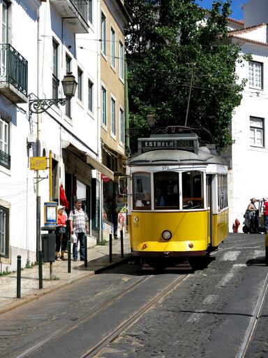 Keywords: lisbon old town tram transport public transport historically nostalgic drive public personennahverkehr stop road portugal traffic