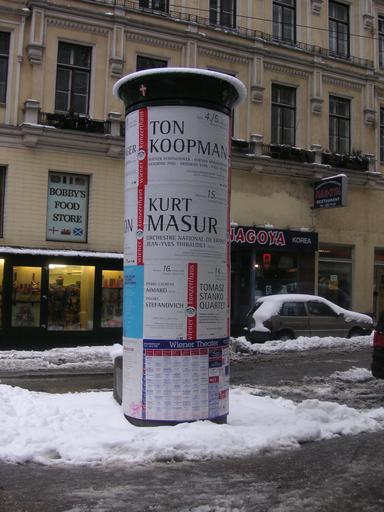 Keywords: Litfaß column Feb05.JPG A Litfaßsäule in Wieden Vienna's 4th district One of the advertisements is for a concert with Kurt Masur; at the bottom there is the weekly programme of the theatres of Vienna At the very top of the column Vienna's coat of arms signifies that this is municipal property By the way Bobby's Food Store in the background is one of the few places in Vienna where one can buy British food imports biscuits sweets soft drinks beer tea etc etc despite its US-sounding name own KF 1 <br/>Transferred from http //en wikipedia org en wikipedia to Commons by User Sreejithk2000 using http //tools wikimedia de/~magnus/commonshelper php CommonsHelper 2005-02 KF at http //en wikipedia org en wikipedia KF Original upload log page en wikipedia Litfa C3 9F_column_Feb05 JPG 2005-09-07 22 02 KF 1920×2560× 2583515 bytes Schleifmühlgasse Vienna Advertising columns in Vienna Snow in Vienna 2005 in Vienna 0216 February 2005 in Austria 16 Kurt Masur Ernst Litfaß |