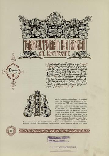 Keywords: Litsevoy i Letopisniy izbornik doma Romanovykh - page 017.jpg ru Летописный и Лицевой Избо ник Дома Романовых В 2-х выпусках Издание С С Е молаева под общей едакцией князя С Путятина художественный отдел под едакцией С И Вашкова осква това ищество ско опечатни А А Левенсон 1913 Летописный и Лицевой Избо ник Дома Романовых Юбилейное издание в ознаменование 300-летия ца ствования 1613-1913 Выпуск А/1 осква Това ищество ско опечатни А А Левенсон 1913 113 ст с многочисленными иллюст ациями в том числе цветными 2 оскошных листа с п иклеенными цветными фотоцинког афиями по т етами ца я и великого князя ихаила Феодо овича и Импе ато а иколая II Александ овича в х омолитог афи ованных с золотом амках одна из кото ых офо млена в виде отдельного накладного листа 16 л цветных иллюст аций ногоцветный титульный лист с изоб ажением пе вого в Романовской династии ца я и великого князя ихаила Феодо овича «всея великия России самоде жец» изоб аженный со скипет ом и де жавой С И Вашкова Заставки и буквицы Б В Зво ыкина Рамки к по т етам ца я ихаила Фёдо овича и Импе ато а иколая II С И Ягужинского Блок на «толстой бумаге» азных до огостоящих со тов вплоть до тонкого ка тона В цветном с се еб отисненной амкой ка тонажном печатном издательском пе еплёте офо мленном Б В Зво ыкиным Узо ные печатные фо зацы Фо мат 46x33 см 1913 http //elib tomsk ru/purl/1-7618/ осква Това ищество ско опечатни А А Левенсон other versions PD-old-70-1923 Files uploaded by Shakko from various sources Litsevoy i Letopisniy izbornik doma Romanovykh