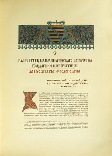 Keywords: Litsevoy i Letopisniy izbornik doma Romanovykh - Alexandra Fedorovna (expl.).jpg ru Летописный и Лицевой Избо ник Дома Романовых В 2-х выпусках Издание С С Е молаева под общей едакцией князя С Путятина художественный отдел под едакцией С И Вашкова осква това ищество ско опечатни А А Левенсон 1913 Летописный и Лицевой Избо ник Дома Романовых Юбилейное издание в ознаменование 300-летия ца ствования 1613-1913 Выпуск А/1 осква Това ищество ско опечатни А А Левенсон 1913 113 ст с многочисленными иллюст ациями в том числе цветными 2 оскошных листа с п иклеенными цветными фотоцинког афиями по т етами ца я и великого князя ихаила Феодо овича и Импе ато а иколая II Александ овича в х омолитог афи ованных с золотом амках одна из кото ых офо млена в виде отдельного накладного листа 16 л цветных иллюст аций ногоцветный титульный лист с изоб ажением пе вого в Романовской династии ца я и великого князя ихаила Феодо овича «всея великия России самоде жец» изоб аженный со скипет ом и де жавой С И Вашкова Заставки и буквицы Б В Зво ыкина Рамки к по т етам ца я ихаила Фёдо овича и Импе ато а иколая II С И Ягужинского 1913 http //www vnikitskom ru/antique/auction/13/4825/ осква Това ищество ско опечатни А А Левенсон other versions PD-old-70-1923 Files uploaded by Shakko from various sources Litsevoy i Letopisniy izbornik doma Romanovykh |