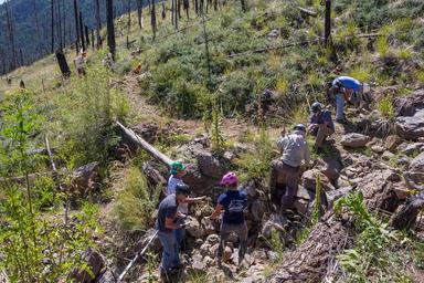 MAKE A MEME View Large Image Crew members used rocks to build up the trail bed and create protective structures in a drainage to help reduce erosion. The area around Little Bear Trail in the Dry Lake Hills north of Flagstaff, Arizona was burned in 2010 by the Schultz ...
