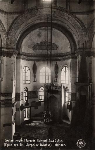 | Keywords: little hagia sophia mosque littlehagiasophiamosque küçük ayasofya camii küçükayasofyacamii aya sergios ve bachos kilisesi ayasergiosvebachoskilisesi aziz sergius ve aziz bacchus azizsergiusveazizbacchus küçük ayasofya küçükayasofya iustinianos camii kilise kapıağası hüseyin ağa kapıağasıhüseyinağa bizans byzantium byzantine salt araştırma saltaraştırma salt research saltresearch salt online saltonline monochrome architecture indoor www.archives.saltresearch.org/R/-?func=dbin-jump-full&amp... “XVI. yüzyılın başlarında II. Bayezid döneminin Kapıağası Hüseyin Ağa tarafından camiye çevrilmiş bir Bizans kilisesi olup yakınına bir zâviye ile kurucusunun türbesi de eklenmiştir. [...] Ayasofya’nın da kurucusu olan Iustinianos tarafından 530 yılına doğru inşa ettirilmiştir. İki eserin plan bakımından bazı benzerlikler taşıması sebebiyle buraya Türk devrinde Küçük Ayasofya denilmiştir. [...] Küçük Ayasofya Camii, esasını teşkil eden büyük bir kubbenin hâkim olduğu merkezî planlı Erken Bizans dönemi yapılarının güzel bir örneğidir. [...] Camiye dönüştürüldükten sonra üzerinde yapılan değişikliklerin büyük bir kısmı klasik Türk sanatının örnekleridir. Böylece Küçük Ayasofya Camii, Bizans ve Türk mimarilerinin birbiri içine grift olduğu bir eser halinde günümüze kadar gelmiştir.” Kaynak: Semavi Eyice, “TDV İslâm Ansiklopedisi”, 2002, Cilt 26, ss. 520-522 Küçük Ayasofya Camii, iç mekân SALT Araştırma - Ali Saim Ülgen Arşivi www.archives.saltresearch.org/R/-?func=dbin-jump-full&amp... “XVI. yüzyılın başlarında II. Bayezid döneminin Kapıağası Hüseyin Ağa tarafından camiye çevrilmiş bir Bizans kilisesi olup yakınına bir zâviye ile kurucusunun türbesi de eklenmiştir. [...] Ayasofya’nın da kurucusu olan Iustinianos tarafından 530 yılına doğru inşa ettirilmiştir. İki eserin plan bakımından bazı benzerlikler taşıması sebebiyle buraya Türk devrinde Küçük Ayasofya denilmiştir. [...] Küçük Ayasofya Camii, esasını teşkil eden büyük bir kubbenin hâkim olduğu merkezî planlı Erken Bizans dönemi yapılarının güzel bir örneğidir. [...] Camiye dönüştürüldükten sonra üzerinde yapılan değişikliklerin büyük bir kısmı klasik Türk sanatının örnekleridir. Böylece Küçük Ayasofya Camii, Bizans ve Türk mimarilerinin birbiri içine grift olduğu bir eser halinde günümüze kadar gelmiştir.” Kaynak: Semavi Eyice, “TDV İslâm Ansiklopedisi”, 2002, Cilt 26, ss. 520-522 Küçük Ayasofya Camii, iç mekân SALT Araştırma - Ali Saim Ülgen Arşivi |