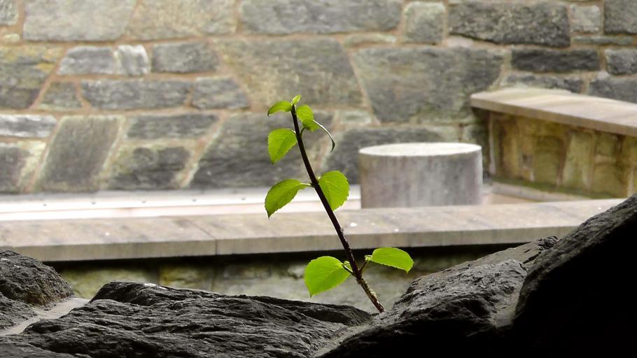 Keywords: live stone stone wall grow plant sprout leaves vitality hope branch light