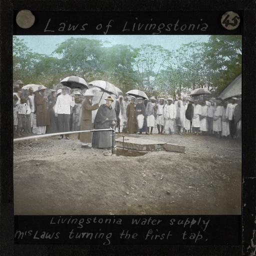 | Keywords: Livingstonia Water Supply, Malawi, ca. 1894-1904 (imp-cswc-GB-237-CSWC47-LS5-1-045).jpg en <br> Livingstonia Water Supply Malawi ca 1894-1904 Livingstonia water supply Mrs Laws turning the first tap Photograph of Mrs Laws the wife of the Scottish missionary Dr Robert Laws turning on the Livingstonia water supply There is a large group gathered behind her to watch the first tap being turned on A number of people are holding umbrellas Livingstonia was founded in 1894 by missionaries from the Free Church of Scotland ; This belongs to a series of Church of Scotland Foreign Missions Committee lantern slides relating to Dr Robert Laws 1851-1934 the Scottish Missionary In 1875 inspired by David Livingstone 1813-1873 Laws travelled to Malawi and was involved in the foundation of the mission station of Livingstonia on the shores of Lake Nyasa During the succeeding 50 years he also established a network of hundreds of schools In 1908 Laws was elected moderator of the General Assembly of the United Free Church of Scotland Photographer Unknown Subject personal name Laws Robert 1851-1934 Filename imp-cswc-GB-237-CSWC47-LS5-1-045 tif Coverage date 1875/1925 Part of collection International Mission Photography Archive ca 1860-ca 1960 Type images Part of subcollection Photographs from the Centre for the Study of World Christianity University of Edinburgh U K ca 1900-ca 1940s Repository name Centre for the Study of World Christianity Archival file impaunpub_Volume7/1549 url Repository address The University of Edinburgh School of Divinity New College Mound Place Edinburgh EH1 2LX United Kingdom Geographic subject country Malawi Format aacr2 1 lantern slide 8 x 8 cm Geographic subject continent Africa Rights Contact the repository for details Part of series Laws of the Pioneer LS5/1 Repository email divinity-CSWC ed ac uk Subject lcsh Keyword Water-supply; Building Date created 1875/1925 Publisher of the digital version University of Southern California Libraries Subject aat genre general views Format aat lantern slides Legacy record ID impa-m68632 Access conditions http //www ed ac uk/schools-departments/divinity/research/centres/world-christianity/collections-resources File GB 237 CSWC47/LS5/1/45 1875/1925 author http //digitallibrary usc edu/cdm/ref/collection/p15799coll123/id/64668 PD-old-70-1923 Magic lantern images Images from USC Digital Library uploaded by Fæ International Mission Photography Archive ca 1860-ca 1960 |