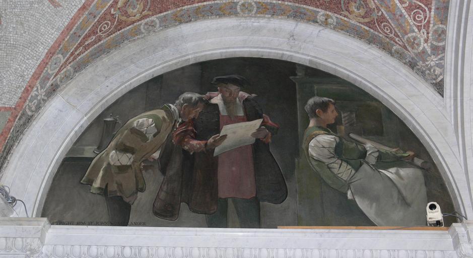 | Keywords: LoC Alexander Evolution of the book Gutenberg.jpg John White Alexander The Printing Press showing Johannes Gutenberg from the cycle The Evolution of the Book <br />Library of Congress Jefferson Building Washington D C own own photograph 2007-05 Painting John White Alexander 1856 “1915 ; Photo Andreas Praefcke http //hdl loc gov/loc pnp/cph 3c04445 Painting PD-old Photograph Monuments and memorials to Johannes Gutenberg Books in art Printing Interior of Thomas Jefferson Building Paintings in the Thomas Jefferson Building Printers in art Photos by User AndreasPraefcke |