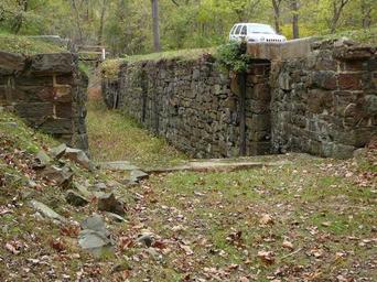 Keywords: Lock 59 C and O from NPS.jpg en Lock 59 second composite lock on Chesapeake and Ohio Canal NPS site says Lock 59 is the second of the 13 composite locks These locks differ from the other locks on the canal Between the upper end of the lower gate pockets to the lower end of the upper gate pockets the stone walls were moved 9 ¼° on each side resulting in a clear dimension between lock walls of 16 ™-16 ½ rather that the 15 ™ previously adhered to The normal clear dimension was resumed both up and down from these points The walls were of rough-cut and rough-coursed limestone principally dry-laid where the walls were widened and mortared in the other areas The wider area was filled in with 5 ¼ square timbers This wooden section of the lock was water-proofed at first by being kyanized and later with creosote The wood timbers required frequent replacing and around 1900 many repairs were made by stripping out the wood and pouring a cement liner but at Lock 59 cement was not used The wooden coping and most of the wood lining at Lock 59 is gone but a few remnants remain especially on the berm side wall In the mid-1870s Lock 59 was extended at its lower end by rock-filled wood cribbage in order to double its length The wooden portion of the extension is largely gone but the lines of rock remain National Park Service http //www hscl cr nps gov/insidenps/report asp STATE PARK CHOH STRUCTURE SORT RECORDNO 921 National Park Service Dept of Interior US Government Chesapeake Ohio Canal National Historical Park Locks water transport PD-USGov |