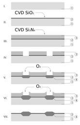 Keywords: Locos (microtechnology) process.svg The image illustrates the LOCOS technology used in microfabrication mostly to create isolating structures I Preparation of silicon substrate II CVD deposition of SiO2 pad/buffer oxide III CVD deposition of Si3N4 nitride mask IV Etching of nitride layer and silicon oxide layer V Thermal growth of silicon oxide VI Furhter growth of thermal silicon oxide VII Removal of nitride mask 1 Si silicon substrate 2 SiO2 pad/buffer oxide chemical vapor deposition silicon oxide 3 Si3N4 nitride mask 4 SiO2 isolation oxide thermal oxide Own 2008-01-19 Twisp Thermal oxidation SVG microtechnology Chemical vapour deposition |