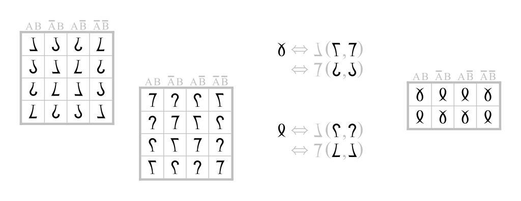 | Keywords: Logical connectives table condensed.svg  The rules seen in File Logical connectives table svg and File Logical connectives table with shorthands svg in condensed form The two squares are Cayley tables of the Klein four-group own Mate2code Propositional logic Nibble shorthands Group Z2 2; Cayley tables Cc-zero |