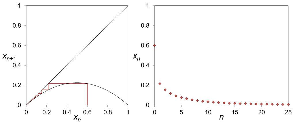 Logistic map cobweb and time evolution a=0.9.png (2014x842)