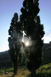 Keywords: lombardi poplars two trees tall green sun peering light mountain