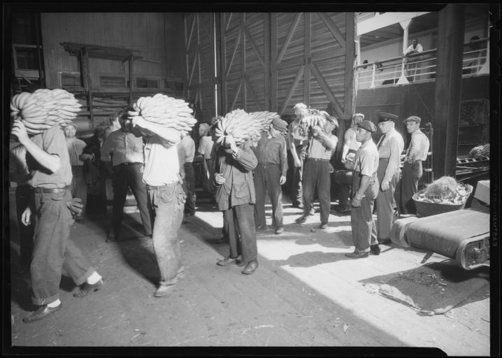 | Keywords: nara:arcid=518791 u.s. national archives usnationalarchives lewis hine lewishine blackandwhite monochrome black and white Original Caption:  New York, New York - Longshoremen. This shows the prevailing method of transferring bananas from the end on the conveyor that carries them from the hold of the shop onto the dock. Then they are taken on the men's shoulders across the docks and into freight cars that are lightered across East River to freight trains going westward. The boat has just arrived from Mexico with Mexican Gold bananas. This is Pier No. 13, East River, - New York and Cuba Mail Steamship Line, July 1937  U.S. National Archives’ Local Identifier: 69-RP-727A  Photographer:  Hine, Lewis   Subjects: The New Deal Tennessee Valley Authority Works Progress Administration Work Portraits The Great Depression   Persistent URL:  research.archives.gov/description/518791  Repository:  Still Picture Records Section, Special Media Archives Services Division (NWCS-S), National Archives at College Park, 8601 Adelphi Road, College Park, MD, 20740-6001.   For information about ordering reproductions of photographs held by the Still Picture Unit, visit: www.archives.gov/research/order/still-pictures.html  Reproductions may be ordered via an independent vendor. NARA maintains a list of vendors at www.archives.gov/research/order/vendors-photos-maps-dc.html   Access Restrictions: Unrestricted Use Restrictions: Unrestricted Original Caption:  New York, New York - Longshoremen. This shows the prevailing method of transferring bananas from the end on the conveyor that carries them from the hold of the shop onto the dock. Then they are taken on the men's shoulders across the docks and into freight cars that are lightered across East River to freight trains going westward. The boat has just arrived from Mexico with Mexican Gold bananas. This is Pier No. 13, East River, - New York and Cuba Mail Steamship Line, July 1937  U.S. National Archives’ Local Identifier: 69-RP-727A  Photographer:  Hine, Lewis   Subjects: The New Deal Tennessee Valley Authority Works Progress Administration Work Portraits The Great Depression   Persistent URL:  research.archives.gov/description/518791  Repository:  Still Picture Records Section, Special Media Archives Services Division (NWCS-S), National Archives at College Park, 8601 Adelphi Road, College Park, MD, 20740-6001.   For information about ordering reproductions of photographs held by the Still Picture Unit, visit: www.archives.gov/research/order/still-pictures.html  Reproductions may be ordered via an independent vendor. NARA maintains a list of vendors at www.archives.gov/research/order/vendors-photos-maps-dc.html   Access Restrictions: Unrestricted Use Restrictions: Unrestricted  |