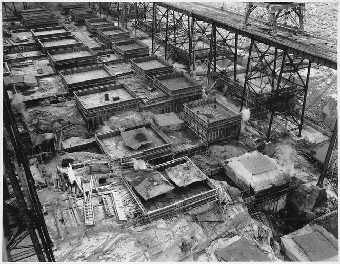 Keywords: Looking down on blocks of concrete poured in the central portion of the dam and west side power house area - NARA - 294234.tiff Scope and content Photograph from Volume Two of a series of photo albums documenting the construction of the Grand Coulee Dam and related work on the Columbia Basin Project General notes 294234 Local identifier Department of the Interior Bureau of Reclamation Engineering and Research Center 05/18/1981 - 03/04/1988 NARA's Rocky Mountain Region Denver NRGA Building 48 Denver Federal Center West 6th Avenue and Kipling Street Denver CO 80225-0307 1936-02-03 Record group Record Group 115 Records of the Bureau of Reclamation 1889 - 2008 Record group ARC 444 Photograph albums compiled 1903 - 1972 Series ARC 293611 File unit File unit ARC Variant control numbers NAIL Control Number NRG-115-CONSTPHO85006-COLBASIN2964 yes Other versions <gallery> File Looking down on blocks of concrete poured in the central portion of the dam and west side power house area - NARA - 294234 tiff tif File Looking down on blocks of concrete poured in the central portion of the dam and west side power house area - NARA - 294234 jpg jpg </gallery> NARA-cooperation PD-USGov Construction of the Grand Coulee Dam NARA TIF images with categorized JPGs |