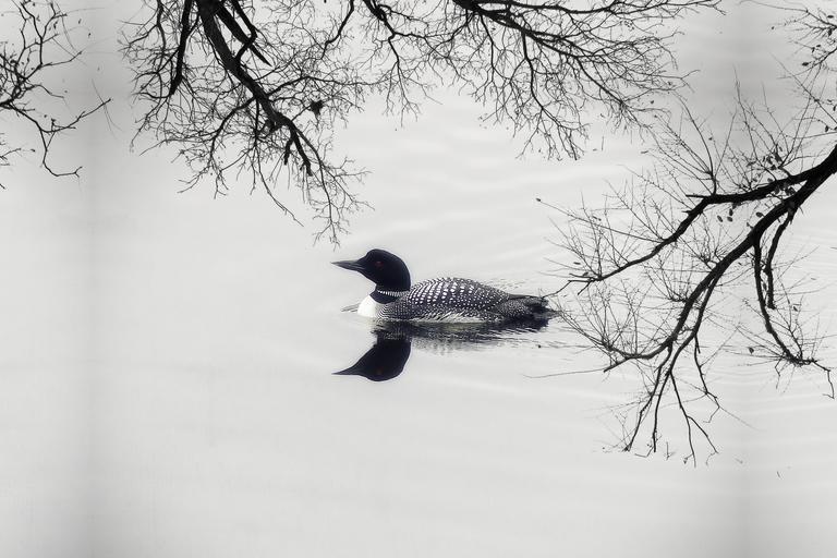 Keywords: loon duck goose water bird feathered lake canim lake british columbia nature scenery outdoor season early morning gaviidae animal wild life tree branches