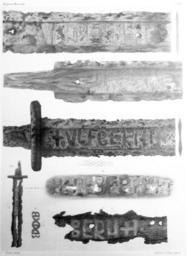 Keywords: Lorange 1889 TabII.jpg en Lorange 1889 Table II Ulfberht swords from Bergen Museum Fig 1 Svaerd fundet paa Thorsthvet i Hodrum ved Laurvik sandsynligvis i Haug B M No 882 Fig 2 Haugfundet Svaerd fra Hellebust i Viks S Indre Holmedal Sondfjord B M No 1165 Fig 3 Haugfundet Svaerd fra Holden i Hevne Nordmore B M No 2695 Fig 4 Haugfundet Svaerd fra Bale i Balestrands Praestegjaeld i Sogn B M No 946 Fig 5 Haugfundet Svaerd fra Saeim i Graven Hardanger B M No 3460 1889 Anders Lorange Den yngre jernalders sværd H Bucher jnr del other versions PD-old-70-1923 Ulfberht swords Collections of the Bergen Museum |