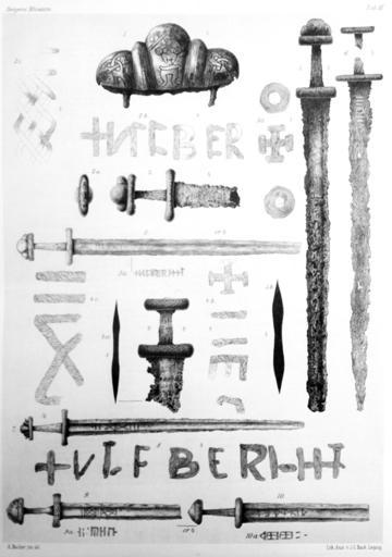 Keywords: Lorange 1889 TabIII.jpg en Lorange 1889 Table III Viking Age swords found in Norway mostly in Bergen Museum Figs 2 3 and 8 have Ulfberht inscriptions the other blades shown have markings very similar to the Ulfberht type Fig 1 Svardknap funden i Jorden paa Sandboi Vaage Gudbrandsdalen B M No 1564 Fig 2 Svaerd fundet i Vanse paa Lister Fundomstaendighederne ubekjendt Stav M No 1021 Fig 3 Svaerd fra Aker i Vang Hedemarken sandsynligvis haugfundet Univ No 4690 Fig 4 Svaerd fra Skarsten i Olden Annex til Indviken Nordfjord sandsynligvis haugfundet B M 3993 Fig 5 Svaerd fra Thorblaa i Ulvik Hardanger Gravfundet B M No 2799 Fig 6 Haugfundet Svaerd fra Moklebust i Eid Nordfjord B M No 1737 Fig 7 Haugfundet Svaerd fra Braekke i Hoprekstad Vik i Sogn B M No 1204 Fig 8 Svaerd fra Hedemarken Univ No 257 Fig 9 Haugfundet Svaerd fra Snartum i Birid Christians Amt Univ No 8301 Fig 10 Haugfundet Svaerd fra Farmen i Vang Hedemarken Loranges Saml i Fredrikshald No 397 1889 Anders Lorange Den yngre jernalders sværd H Bucher jnr del other versions PD-old-70-1923 Ulfberht swords Viking swords Collections of the Bergen Museum |