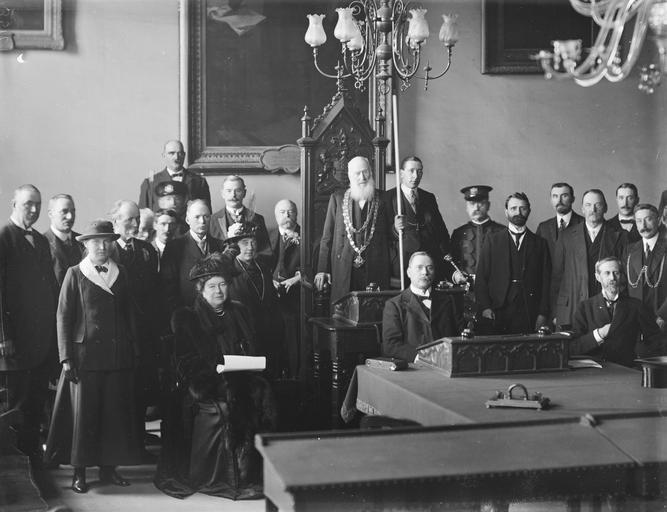 | Keywords: a.h. poole ahpoole arthur henri poole arthurhenripoole poole collection poolecollection glass negative glassnegative lord lieutenant lordlieutenant corporation ireland munster john harrison johnharrison sergeant-at-mace sergeantatmace lord mayor lordmayor saturday 7th november 1914 1910s 20th century 20thcentury people identified peopleidentified viceroy lord aberdeen lordaberdeen lady aberdeen ladyaberdeen fagan shield faganshield sir john fagan sirjohnfagan st. dominick industrial school stdominickindustrialschool good shepherd nuns goodshepherdnuns sir william thompson sirwilliamthompson lord mayor of waterford lordmayorofwaterford richard power richardpower high sheriff of waterford highsheriffofwaterford m. mcdonald mmcdonald waterford corporation waterfordcorporation city hall cityhall folding camera foldingcamera daniel o'connell danieloconnell portrait john hamilton-gordon johnhamiltongordon 1st marquess of aberdeen and temair 1stmarquessofaberdeenandtemair lord lieutenant of ireland lordlieutenantofireland earl of aberdeen earlofaberdeen ishbel maria marjoribanks ishbelmariamarjoribanks waterford national library of ireland nationallibraryofireland blackandwhite monochrome black and white This is a terribly grand group at a ceremony at City Hall in Waterford. We now know that the "Lord Lieutenant and Lady Aberdeen visited Waterford yesterday for the purpose of presenting the Fagan Shield (the gift of Sir John Fagan) to the St. Dominick Industrial School, conducted by the Good Shepherd Nuns ... At the City Hall, an address from the Corporation to Lady Aberdeen was read..." We've visited this room before, on Monday, 20 August 1928 for a "civic welcome" to a Fr. Walsh. From the newspaper report below, it looks as if this was taken at Waterford City Hall. Thanks to ofarrl, we're already ahead of the posse on this photo. We know that that the tremendously titled Sergeant-at-Mace, John Harrison, is in this photo. John was unearthed by his great great grand niece (think that's right), Mrslulu1 in this 1903 photo, alongside millionaire industrialist and library philanthropist Andrew Carnegie... Date: Saturday, 7 November 1914 NLI Ref: POOLEWP 2570 You can also view this image, and many thousands of others, on the NLI’s catalogue at catalogue.nli.ie This is a terribly grand group at a ceremony at City Hall in Waterford. We now know that the "Lord Lieutenant and Lady Aberdeen visited Waterford yesterday for the purpose of presenting the Fagan Shield (the gift of Sir John Fagan) to the St. Dominick Industrial School, conducted by the Good Shepherd Nuns ... At the City Hall, an address from the Corporation to Lady Aberdeen was read..." We've visited this room before, on Monday, 20 August 1928 for a "civic welcome" to a Fr. Walsh. From the newspaper report below, it looks as if this was taken at Waterford City Hall. Thanks to ofarrl, we're already ahead of the posse on this photo. We know that that the tremendously titled Sergeant-at-Mace, John Harrison, is in this photo. John was unearthed by his great great grand niece (think that's right), Mrslulu1 in this 1903 photo, alongside millionaire industrialist and library philanthropist Andrew Carnegie... Date: Saturday, 7 November 1914 NLI Ref: POOLEWP 2570 You can also view this image, and many thousands of others, on the NLI’s catalogue at catalogue.nli.ie |