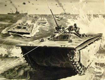 | Keywords: vehicle Lot 2290-2: Landing Vehicle Tracked (LVT), amphibious warfare vehicle. Artwork shows “Water Buffalos,” designed, engineered and built by Food Machinery Corporation Division at Lakeland, Florida; Los Angeles, San Jose, and Riverside, California. Photograph donated by Food Machinery in June 1945. (8/28/2015). Lot 2290-2: Landing Vehicle Tracked (LVT), amphibious warfare vehicle. Artwork shows “Water Buffalos,” designed, engineered and built by Food Machinery Corporation Division at Lakeland, Florida; Los Angeles, San Jose, and Riverside, California. Photograph donated by Food Machinery in June 1945. (8/28/2015). |