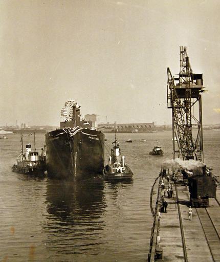 | Keywords: outdoor monochrome Lot-3452-7: Biography of a Liberty Ship. Less than five months from keel-laying to launching ceremony was the record set by SS Patrick Henry. This time is being reduced to sixty days in the construction of her sister ships of the Liberty Ship design. This standard design was selected by the Maritime Commission to meet the need for a ship that can be built in existing yards in minimum time with the additional purpose of conserving materials vitally needed for the war production effort. Prefabrication of sections in special plants, replacing of riveting wherever possible by welding and other new departures all contribute to the speed of construction and saving of material and dead weight in these ships which are already proving their worth in the War on the Axis. On 27 September 1941, SS Patrick Henry, the first U.S. Liberty ship, was launched at Baltimore, Maryland. Numerous other vessels were launched on that day, known as "Liberty Fleet Day." Surviving World War II, Patrick Henry was scrapped in 1960. U.S. Office of Emergency Management Photograph. Courtesy of the Library of Congress. (2015/05/06). Lot-3452-7: Biography of a Liberty Ship. Less than five months from keel-laying to launching ceremony was the record set by SS Patrick Henry. This time is being reduced to sixty days in the construction of her sister ships of the Liberty Ship design. This standard design was selected by the Maritime Commission to meet the need for a ship that can be built in existing yards in minimum time with the additional purpose of conserving materials vitally needed for the war production effort. Prefabrication of sections in special plants, replacing of riveting wherever possible by welding and other new departures all contribute to the speed of construction and saving of material and dead weight in these ships which are already proving their worth in the War on the Axis. On 27 September 1941, SS Patrick Henry, the first U.S. Liberty ship, was launched at Baltimore, Maryland. Numerous other vessels were launched on that day, known as "Liberty Fleet Day." Surviving World War II, Patrick Henry was scrapped in 1960. U.S. Office of Emergency Management Photograph. Courtesy of the Library of Congress. (2015/05/06). |
