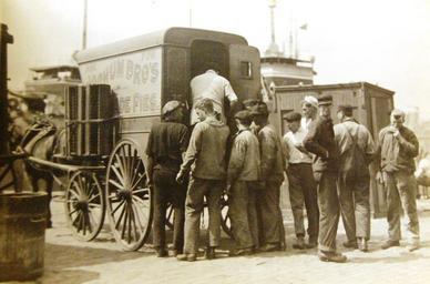 Keywords: monochrome Lot 5371-11: New York (Brooklyn) Navy Yard, New York City, New York. Yard workers buying pies from truck with appears to read, “All for Jochum Brother’s Homemade Pies.” Photograph album donated by the heirs of Secretary of the Navy Josephus Daniels. (6/12/2015). Lot 5371-11: New York (Brooklyn) Navy Yard, New York City, New York. Yard workers buying pies from truck with appears to read, “All for Jochum Brother’s Homemade Pies.” Photograph album donated by the heirs of Secretary of the Navy Josephus Daniels. (6/12/2015). |