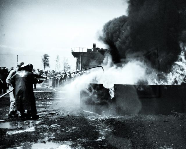 Keywords: outdoor monochrome Lot-840-10: “Firemen of the Fleet,” August 15, 1943. In peace or war, there is one foe eternally feared by every man that goes to sea – fire. In wartime, fire is twice as deadly in peace. Ignited by enemy shells or bombs, the flames menace personnel already busy at their battle stations – and every man called from his post gives the foe that much more advantage during action. Thus the Navy has founded fire-fighting schools to train specialists in the grim art of extinguishing fires anywhere aboard ship quickly and methodically. Different methods are taught the seagoing fireman for combatting flames in different sections of the ship. To lend realism to the courses, substantial “mock-ups” of vessels have been built, in which the trainees learn their grim lessons, mater the use of their flame-fighting equipment. Shown: Officers Fight Flames Too! Enrollment in firefighting school isn’t limited to enlisted men. These two officers get pointers from an instructor during assault on an open tank oil fire. U.S. Navy Photograph. Courtesy of the Library of Congress. (2016/04/14). Photographed through Mylar sleeve. Lot-840-10: “Firemen of the Fleet,” August 15, 1943. In peace or war, there is one foe eternally feared by every man that goes to sea – fire. In wartime, fire is twice as deadly in peace. Ignited by enemy shells or bombs, the flames menace personnel already busy at their battle stations – and every man called from his post gives the foe that much more advantage during action. Thus the Navy has founded fire-fighting schools to train specialists in the grim art of extinguishing fires anywhere aboard ship quickly and methodically. Different methods are taught the seagoing fireman for combatting flames in different sections of the ship. To lend realism to the courses, substantial “mock-ups” of vessels have been built, in which the trainees learn their grim lessons, mater the use of their flame-fighting equipment. Shown: Officers Fight Flames Too! Enrollment in firefighting school isn’t limited to enlisted men. These two officers get pointers from an instructor during assault on an open tank oil fire. U.S. Navy Photograph. Courtesy of the Library of Congress. (2016/04/14). Photographed through Mylar sleeve. |