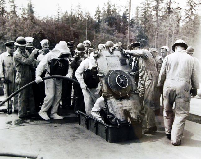 Keywords: outdoor Lot-840-12: “Firemen of the Fleet,” August 15, 1943. In peace or war, there is one foe eternally feared by every man that goes to sea – fire. In wartime, fire is twice as deadly in peace. Ignited by enemy shells or bombs, the flames menace personnel already busy at their battle stations – and every man called from his post gives the foe that much more advantage during action. Thus the Navy has founded fire-fighting schools to train specialists in the grim art of extinguishing fires anywhere aboard ship quickly and methodically. Different methods are taught the seagoing fireman for combatting flames in different sections of the ship. To lend realism to the courses, substantial “mock-ups” of vessels have been built, in which the trainees learn their grim lessons, mater the use of their flame-fighting equipment. Shown: Down and Out. Asbestos-clad firefighters go down – and soon the fire will go out. This group is learning the intricacies of fighting fires below deck. Trick is to get down the hatch fast – not missing their footing despite limited visibility. U.S. Navy Photograph. Courtesy of the Library of Congress. (2016/04/14). Photographed through Mylar sleeve. Lot-840-12: “Firemen of the Fleet,” August 15, 1943. In peace or war, there is one foe eternally feared by every man that goes to sea – fire. In wartime, fire is twice as deadly in peace. Ignited by enemy shells or bombs, the flames menace personnel already busy at their battle stations – and every man called from his post gives the foe that much more advantage during action. Thus the Navy has founded fire-fighting schools to train specialists in the grim art of extinguishing fires anywhere aboard ship quickly and methodically. Different methods are taught the seagoing fireman for combatting flames in different sections of the ship. To lend realism to the courses, substantial “mock-ups” of vessels have been built, in which the trainees learn their grim lessons, mater the use of their flame-fighting equipment. Shown: Down and Out. Asbestos-clad firefighters go down – and soon the fire will go out. This group is learning the intricacies of fighting fires below deck. Trick is to get down the hatch fast – not missing their footing despite limited visibility. U.S. Navy Photograph. Courtesy of the Library of Congress. (2016/04/14). Photographed through Mylar sleeve. |