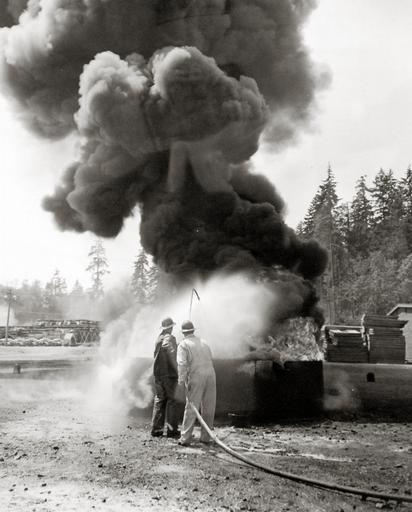 Keywords: outdoor monochrome Lot-840-5: “Firemen of the Fleet,” August 15, 1943. In peace or war, there is one foe eternally feared by every man that goes to sea – fire. In wartime, fire is twice as deadly in peace. Ignited by enemy shells or bombs, the flames menace personnel already busy at their battle stations – and every man called from his post gives the foe that much more advantage during action. Thus the Navy has founded fire-fighting schools to train specialists in the grim art of extinguishing fires anywhere aboard ship quickly and methodically. Different methods are taught the seagoing fireman for combatting flames in different sections of the ship. To lend realism to the courses, substantial “mock-ups” of vessels have been built, in which the trainees learn their grim lessons, mater the use of their flame-fighting equipment. Shown: Go Gallons A Minute. That’s the amount of water hurled against the “test” fire by this spray. 100 pounds of pressure forces the water out in an “umbrella” which protects the fireman from the searing flames. U.S. Navy Photograph. Courtesy of the Library of Congress. (2016/04/14). Photographed through Mylar sleeve. Lot-840-5: “Firemen of the Fleet,” August 15, 1943. In peace or war, there is one foe eternally feared by every man that goes to sea – fire. In wartime, fire is twice as deadly in peace. Ignited by enemy shells or bombs, the flames menace personnel already busy at their battle stations – and every man called from his post gives the foe that much more advantage during action. Thus the Navy has founded fire-fighting schools to train specialists in the grim art of extinguishing fires anywhere aboard ship quickly and methodically. Different methods are taught the seagoing fireman for combatting flames in different sections of the ship. To lend realism to the courses, substantial “mock-ups” of vessels have been built, in which the trainees learn their grim lessons, mater the use of their flame-fighting equipment. Shown: Go Gallons A Minute. That’s the amount of water hurled against the “test” fire by this spray. 100 pounds of pressure forces the water out in an “umbrella” which protects the fireman from the searing flames. U.S. Navy Photograph. Courtesy of the Library of Congress. (2016/04/14). Photographed through Mylar sleeve. |