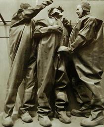 | Keywords: Lot-9433-7: These Are The Ships And The Men Who Deliver Oil To The Allies. Despite Axis submarines, the U.S. is continuing to deliver oil for the Allied war machine. This success is due chiefly to two things – tankers and men. The tankers carry their own “cargo insurance” – big guns for the U-boats, machine guns for enemy aircraft. The men who man them are tough, fearless and capable of meeting any opposition the enemy has to offer. These pictures, made aboard a U.S. tanker, show the men at work and some of the measures taken to protect them. Shown: Still another safety measure is the rubber kapok-packed suit that would keep the sailor afloat until he climbed into a raft. The suit can be donned in one minute, and water and concentrated food can be kept in the breast pockets. Office of War Information Photograph, 16-22 April 1942. Original photograph is small. (2015/12/18). Lot-9433-7: These Are The Ships And The Men Who Deliver Oil To The Allies. Despite Axis submarines, the U.S. is continuing to deliver oil for the Allied war machine. This success is due chiefly to two things – tankers and men. The tankers carry their own “cargo insurance” – big guns for the U-boats, machine guns for enemy aircraft. The men who man them are tough, fearless and capable of meeting any opposition the enemy has to offer. These pictures, made aboard a U.S. tanker, show the men at work and some of the measures taken to protect them. Shown: Still another safety measure is the rubber kapok-packed suit that would keep the sailor afloat until he climbed into a raft. The suit can be donned in one minute, and water and concentrated food can be kept in the breast pockets. Office of War Information Photograph, 16-22 April 1942. Original photograph is small. (2015/12/18). |