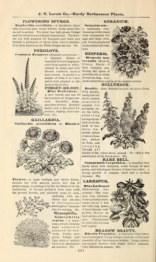 Keywords: Lovett's illustrated catalogue of fruit and ornamental trees and plants for the autumn of 1891 (16814613808).jpg J T Lovett Co Hardy Herbaceous Plants <br> FLOWERING SPURGE <br> Euphorbia corollata A handsome plant <br> with beautiful pure white flowers borne spray-like <br> on tall branches The plant has light green foliage <br> and the whole is exceedingly ornamental The flow- <br> ers are well adapted for bouquets and vases and <br> furnish a profusion of bloom from July to October <br> It is often known as the White Forget-me-not 20c <br> FOXGLOVE <br> Common Foxglove Digitalis purpurea <br> A biennial Spikes of <br> beautiful flowers ranging in <br> color from purple to white <br> tubular in shape and with <br> throats variously spotted <br> and colored It grows to a <br> height of from 5 to 7 feet <br> and Is well adapted to the <br> back of the border <br> FORGET-ME-NOT <br> Blue Perfection <br> A new variety and one of <br> the loveliest of Forget-me- <br> nots Beautiful large <br> pale blue flowers Entirely <br> hardy and a fine plant for <br> borders edging or pot cul- <br> ture oOc <br> GAILLARDIA <br> Oaillardia randiflora or Blanket <br> GERANIUM <br> Sanguineum <br> A handsome free- <br> blooming border plant <br> with ornamental fol- <br> iage and large crim- <br> son flowers produced <br> in abundance all sum- <br> men <br> Flower A most brilliant and showy flower <br> deepest red with maroon centre and tips of <br> petals orange rendering it by far the finest of all the <br> Galllardias It blooms profusely from June until <br> the ground freezes and succeeds upon all soils <br> enduring with pa- <br> tience any amount <br> of ill-treatment <br> and neglect Valuable <br> also for cutting 20c <br> Gypsophilla <br> Gyps o p li i 1 1 a j <br> repens A hand- j <br> some dwarf creeping <br> plant admirably j <br> adapted for rock- ; <br> work Pretty pale ' <br> green foliage and ' <br> V ght pink or reddish <br> flowers in abundance <br> all summer 20c I <br> HESPERIS <br> Hesperis ma- <br> tronalis Rocket <br> Purple White <br> feet; varieties pro- <br> ducing tall spires of <br> purplish-red or white <br> flowers In June Suc- <br> ceeds everywhere and is of the easiest culture <br> HOLLYHOCK <br> Double Red White Yellow Scarlet Pink <br> Well known <br> hardy and tall <br> showy plants; <br> admirably <br> adapted for <br> grouping up- <br> on the lawn <br> plan 1 1 n g <br> among shrub- ' <br> bery or at the <br> back of bor- <br> de r s I m - <br> mense spikes <br> of showy flow- <br> ers perfect <br> in form and <br> ranging <br> through all <br> shades of the colors above named <br> assortment of the finest sorts 20c <br> HARE BELL <br> Campanula Carpathica A beautiful little <br> hardy plant with dentated ovate foliage of dark <br> green and bell-shaped flowers of deep blue color A <br> strong grower of compact habit and a profuse <br> bloomer 20c <br> LARKSPUR <br> Blue Larkspur <br> Delphinium for <br> mosum The com- <br> mon blue Larkspur <br> of our grandmothers <br> Grows about 3 feet <br> tall with long spikes <br> of most intense indi- ' <br> go-blue flowers an <br> inch across all sum- <br> mer Unsurpassed <br> for rich color and has <br> fev equals <br> MEADOW BEAUTY <br> Rliexia Virgiiiica A charming little tuber- <br> ous-rooted plant of easy culture and one of the most <br> beautiful of our late summer flowers Large showy <br> rosy-purple flowers with bright yellow stamens <br> Very effective in masses 20c <br> We offer a flne <br> 50 42764502 136632 68527 Page 50 Text http //www biodiversitylibrary org/page/42764502 1891 10 5962/bhl title 68527 Henry G Gilbert Nursery and Seed Trade Catalog Collection ; J T Lovett Company ; J T Lovett Company NameFound Campanula NameConfirmed Campanula subgen Campanula EOLID 24010291 NameFound Carpathica NameConfirmed Carpathica EOLID 4891254 NameBankID 4104300 NameFound Digitalis purpurea NameConfirmed Digitalis purpurea EOLID 578392 NameBankID 2655933 NameFound Euphorbia corollata NameConfirmed Euphorbia corollata EOLID 1145080 NameBankID 2651804 NameFound Gaillardia NameConfirmed Gaillardia Foug EOLID 38325 NameFound Gypsophilla NameConfirmed Gypsophilla NameBankID 1842227 NameFound Hesperis NameConfirmed Hesperis EOLID 71309 NameBankID 2648753 NameFound Oaillardia randiflora NameConfirmed Gaillardia grandiflora Pursh EOLID 479475 NameFound Sanguineum Biodiversity Heritage Library Lovett's illustrated catalogue of fruit and ornamental trees and plants for the autumn of 1891 Catalogs Commercial catalogs J T Lovett Company Little Silver New Jersey Plants Ornamental Seeds Shrubs U S Department of Agriculture National Agricultural Library bhl page 42764502 dc identifier http //biodiversitylibrary org/page/42764502 bhlGardenStories Foxglove Geranium Gaillardia Larspur Hollyhock j t lovett company little silver new jersey plants ornamental u s department of agriculture national agricultural library bhlgardenstories Information field Flickr posted date ISOdate 2015-04-01 CC-BY-2 0 BioDivLibrary https //flickr com/photos/61021753 N02/16814613808 2015-08-23 20 53 08 cc-by-2 0 PD-old-70-1923 Geranium Gaillardia Lovett's illustrated catalogue of fruit and ornamental trees and plants for the autumn of 1891 Photos uploaded from Flickr by Fæ using a script |