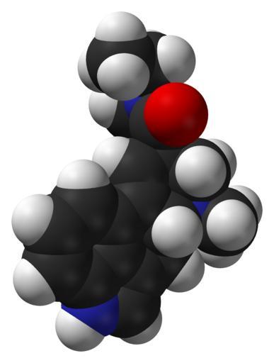| Keywords: LSD-from-xtal-and-Spartan-PM3-3D-sf-web.png Space-filling model of the lysergic acid diethylamide LSD molecule C<sub>20</sub>H<sub>25</sub>N<sub>3</sub>O Colour code Carbon C grey-black Hydrogen H white Nitrogen N blue Oxygen O red Structure based on that found in the related salt LSD o-iodobenzoate monohydrate determined by X-ray crystallography in http //molpharm aspetjournals org/content/9/1/23 abstract Molecular Pharmacology 1973 9 23-32 Model manipulated in http //www crystalmaker com/ CrystalMaker 8 3 The structure of the LSD+H<sup>+</sup> cation from the above crystal structure was opened in http //www wavefun com/products/macintosh/Student/mac_student html Spartan Student 4 1 one hydrogen atom on the R<sub>3</sub>NH<sup>+</sup> group was deleted yielding the neutral LSD molecule Its structure was then refined with the PM3 semi-empirical method Image generated in http //accelrys com/products/discovery-studio/visualization/discovery-studio-visualizer html Accelrys DS Visualizer Own 2011-03-13 Ben Mills Benjah-bmm27 Images by Ben Mills Lysergic acid diethylamide |