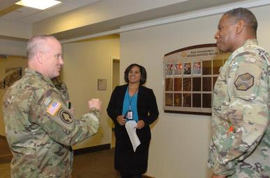 Keywords: Lt. Gen. Kevin Mangum (left), Deputy Commanding General and Chief of Staff for U.S. Army Training and Doctrine Command, talks to Maj. Gen. LaWarren Patterson (right) of U.S. Army Installation Management Command, April 19, 2016, at IMCOM Headquarters on Joint Base San Antonio, Texas. (U.S. Army photo by Geralyn Smith Noah) |