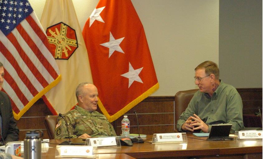 Keywords: Lt. Gen. Kevin Mangum (left), Deputy Commanding General and Chief of Staff for U.S. Army Training and Doctrine Command, talks to Mr. Joseph Capps (right) of U.S. Army Installation Management Command, April 19, 2016, at IMCOM Headquarters on Joint Base San Antonio, Texas. (U.S. Army photo by Geralyn Smith Noah) |