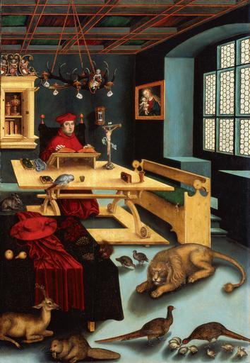 | Keywords: Lucas Cranach d.Ä. - Kardinal Albrecht von Brandenburg als Hieronymus im Gehäus.jpg Artwork Creator Lucas Cranach I 1526 oil panel cm 124 5 81 5 Ringling Museum of Art Sarasota http //ringlingdocents org/albrecht htm The Ringling Museum of Art object history purchased by John Ringling in 1932 credit line LangSwitch Cranachs Werkzeichen wahrscheinlich am Bein des vorderen Tisches Cranach's work sign probably on the leg of the front table en The painting shows Cardinal Albrecht as Saint Jerome seated at his desk in a rather contemporary study A chandelier called a Lusterweibchen hangs from the ceiling It is similar to the one hanging over the picture in our gallery The painting has an elaborate symbolic program which would have been read and understood by educated people of the day In the foreground are a lion Jerome's companion in the desert; a beaver symbolic of industriousness a squirrel indicating frugality a parrot to signal the Annunciation in addition to pheasants a peacock an apple and a deer - all symbolic of characteristics Albrecht wanted associated with himself <ref>http //ringlingdocents org/albrecht htm The Ringling Museum of Art</ref> reflist accession number SN 308 http //www clarus-cranach de/LucasCranachStadel html www clarus-cranach de PD-old-100-1923 1553 DEFAULTSORT Cranach Lucas 1; Albrecht von Brandenburg 1526 Sarasota Paintings of Albert of Hohenzollern by Lucas Cranach I John and Mable Ringling Museum of Art Paintings of Saint Jerome in his study 1526 paintings |