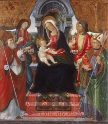 Keywords: Lucchese School Late 15th Century - Virgin and Child with Saints Nicholas, Sebastian, Roch and Martin - Google Art Project.jpg Italy Italy Lucchese 412255 School Late 15th Century Italian /collection/walker-art-gallery-liverpool/artwork/virgin-and-child-with-saints-nicholas-sebastian-roch-and-martin-lucchese-school-late-15th-century/412256/ Lucchese School Late 15th Century /artist/lucchese-school-late-15th-century/4126125/ 4126125 /collection/walker-art-gallery-liverpool/ Walker Art Gallery Liverpool 346008 11/28/2011 4 29 34 PM /collection/walker-art-gallery-liverpool/artwork/virgin-and-child-with-saints-nicholas-sebastian-roch-and-martin-lucchese-school-late-15th-century/412256/ 1400 Late 1400s Lucchese School; religious; altar; Virgin and Child; mother; Madonna; saints; halo; Lucca; praying; glance; gesture; St Nicholas; St Sebastian; St Roch; protection; plague; St Martin; patron saint; rug; throne; Bible 1689 1 412256 False 1400 Without frame 3/24/2012 12 53 00 AM WAG 2780 http //www liverpoolmuseums org uk/picture-of-month/displaypicture asp venue 2 id 169 Walker Art Gallery National Museums Liverpool Bequeathed by PH Rathbone in 1895 Tempera on canvas and board transferred from wood panel 1400 1410 w588 x h1689 cm Late 1400s False 0 865234375 Object virgin-and-child-with-saints-nicholas-sebastian-roch-and-martin-lucchese-school-late-15th-century Virgin and Child with Saints Nicholas Sebastian Roch and Martin v 588 8 tag_/_style Lucchese School; religious; altar; Virgin and Child; mother; Madonna; saints; halo; Lucca; praying; glance; gesture; St Nicholas; St Sebastian; St Roch; protection; plague; St Martin; patron saint; rug; throne; Bible special url_id xAFcRCOFoTYROg PD-art-100 Google Art Project works by unknown artist Lucca Uncategorized 2015 February 26
