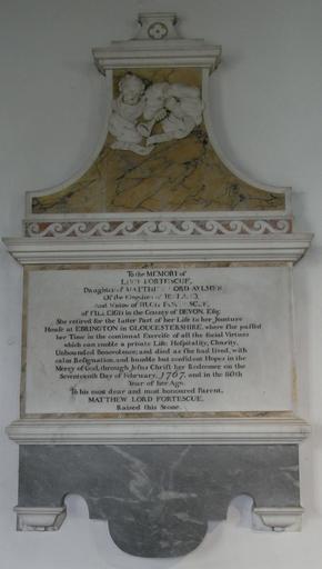 Keywords: LucyFortescueMonumentFilleigh.JPG en Mural monument to Lucy Fortescue d 1767 west wall of south aisle chapel Filleigh Church Devon inscribed To the memory of Lucy Fortescue daughter of Matthew Ford Aylmer of the Kingdom of Ireland and widow of Hugh Fortescue of Filleigh in the county of Devon Esq She retired for the latter part of her life to her jointure house at Ebrington in Gloucestershire where she passed her time in the continual exercise of all the social virtues which can enoble a private life Hospitality Charity Unbounded Benevolence; and died as she had lived with calm resignation and humble but confident hopes in the mercy of God through Jesus Christ her Redeemer; on the seventeenth day of February 1767 and in the 80th year of her age To his most dear and most honoured parent Matthew Lord Fortescue raised this stone own photo Sculptor unknown; own photo Monument 1767; photo Apr 2012 St Paul's church Filleigh Wall mounted church monuments in Devon |