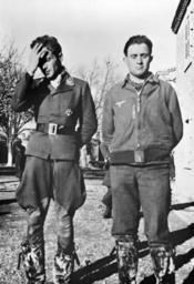 Keywords: Luftwaffe aircrew captured North Africa 1943.jpg German Luftwaffe aircrew captured in North Africa by U S forces in 1943 <br>Original caption German airmen captured in northwest Africa after their bombing plane had been shot down by Allied fliers The pilot left wears the Iron Cross He and the crew member with him tried to escape after a crash landing LOC-image fsa 8e00916 1943 Farm Security Administration - Office of War Information Photograph Collection Library of Congress frame removed PD-USGov Aircrew of the Luftwaffe Wehrmacht German prisoners of war of World War II |