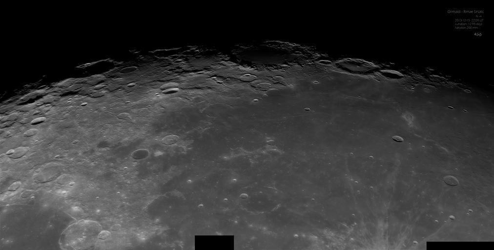 | Keywords: luna rima sirsalis rimasirsalis grimaldi astronomía astronomy moon domos blackandwhite monochrome lunar black and white Mosaico de la parte Oeste de la Luna (el Norte está a la derecha), a partir de unas tomas que había dejado olvidadas... Hecha con un telescopio Newton de 200 mm. Con este ángulo de luz, contrastan numerosos detalles delicados. Muy interesante la Rima Sirsalis (una ranura tectónica de 300 Km de largo, arriba hacia la izquierda), también se ven múltiples "rimae" de tamaño menor. Y a la derecha, si uno se fija, la superficie lunar aparece rugosa, como llena de "granitos": es un extensísimo campo de domos, o sea antiguos volcanes lunares, lástima que se extinguieran hace ya millones de años... La Luna sigue siendo, para mí, un "ser" fascinante. Mosaico de la parte Oeste de la Luna (el Norte está a la derecha), a partir de unas tomas que había dejado olvidadas... Hecha con un telescopio Newton de 200 mm. Con este ángulo de luz, contrastan numerosos detalles delicados. Muy interesante la Rima Sirsalis (una ranura tectónica de 300 Km de largo, arriba hacia la izquierda), también se ven múltiples "rimae" de tamaño menor. Y a la derecha, si uno se fija, la superficie lunar aparece rugosa, como llena de "granitos": es un extensísimo campo de domos, o sea antiguos volcanes lunares, lástima que se extinguieran hace ya millones de años... La Luna sigue siendo, para mí, un "ser" fascinante. |