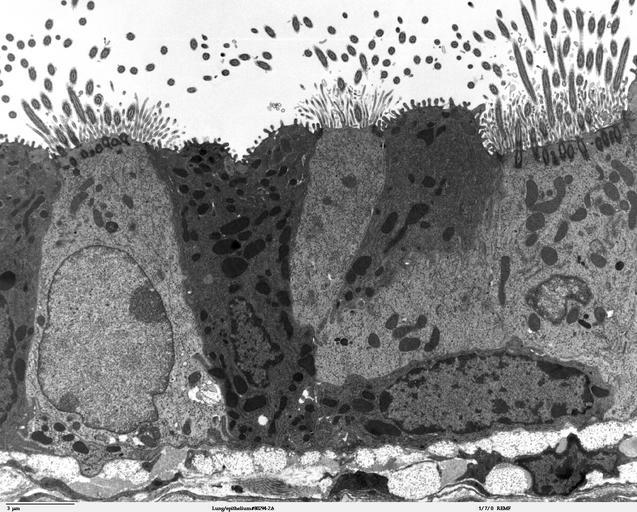 | Keywords: Lung epithelium 80294-2.6.jpg Transmission electron microscope image of a thin section cut through the bronchiolar epithelium of the lung mouse which consists of ciliated cells and non-ciliated cells called Clara cells Image shows the ciliary microtubules in transverse and oblique section In the cell apex are the basal bodies that are the anchoring sites for the ciliary axonemes Note the difference in size and shape between the microvilli and the cilia JEOL 100CX TEM http //remf dartmouth edu/imagesindex html http //remf dartmouth edu/images/mammalianLungTEM/source/13 html Louisa Howard Michael Binder PD Louisa Howard and Michael Binder Cell biology |