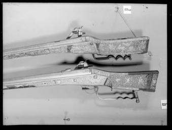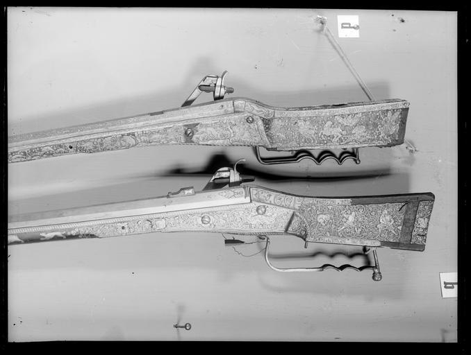 Keywords: Luntlås-hjullåsbössa - Livrustkammaren - 68581.tif Rund slätborrad blånerad pipa med trumf och åttsidig kammare Rektangulärt böjt svansskruvblad Pipans ovansida täckt av nästan yttäckande påslagen dekor av guld och silver rankverk samt på pipans runda del två ovala kartuscher På kammarenssidofaser vid pipbasen stämplar i form av musselskal LRK vägl 1921 195 Därframför en stående naken kvinna med guldslöja över skötet i h hand ett timglas Tiden därovanför textband BEDENCK D S END På kammarens sidor i rankverket infogade framåt springande hundar rävar och harar av guld och silver Baktill på pipans runda del i den bakre kartuschen en stående kvinna med naken överkropp hellång guldkjol i h hand en guldvåg i v ett svärd med guldfäste Mittpå den runda delen i den främre kartuschen en stående kvinna huvudet profil h lång klänning av guld i h hand ett palmblad av guld i den v en otydlig figur stadsmodell 55 mm från mynningen en graverad björn på ryggen uppåtriktade svinbortsliknande hår sittande och spelande på en säckpipa av guld <br/>Riktmedel Mellan kartuscherna björnen och kornet påslaget en silversiktlist Inlaxade riktmedel siktet saknas korn av silver <br/>Fästning Tre häften Pipan fäst med krysskruv underifrån varbygelskruven samt tre nya pipstift av trä <br/><br/>Hjullås med plant blånerat bakåt i avsatser avsmalnande låsbleck av stål litet rundat ändutskott Hjul fäst med inåtlutande ring samt välvd hjulkapsel Fängpanna utan krutskärm lock med rörlig rektangulär arm Tryckknapp med svagt välvt huvud med skruvskåra Lång hane med kropp med fyrsidigt tvärsnitt innerkanten fasad nästan ringformig hanhals Överkäken lös kort svagt uppåtsvängt fingergrepp med ändvulst Hanskruv med fyrsidigt huvud Kraftig hanfjäder främre delen med rundade kanter bakre hälften med rankdekor ingen studel långt spetsigt åsat löv På låsblecket hjulkapseln och fängpannegaveln påslagen dekor av guld och silver rankverk och bakom hjulet två guldfåglar och en av silver framför hjulet ett bakåtseende rovdjur med kort svans och prickig päls leopard Nedanför säkringsfjädern samma stämpel som på pipan På fängpannelocket en graverad lejonmaskaron på armen ett serafhuvud med vingarna riktade bakåt På hanen graverad bladdekor på ringen på spetsen en maskaron <br/>Säkring Bakom hjulet virvelsäkring med ringformigt fingergrepp fjäder med streckdekor studel med droppformigt svagt välvt löv med mittstreck <br/>Fästning Två låsskruvar <br/>Avtryckare Rak avtryckare med liten ändkula i avtryckarblecket en ställskruv infälld i kolven <br/><br/>Helstock av valnöt med liten vinge kolvlåda och sluten laddstocksränna Nästan yttäckande dekor av vita och grönfärgade beninläggningar hjorthorn Bakplåten samt kantlisterna runt kolvänden saknas nästan helt Utefter stockens kanter lister med beslagsornamentik och flätmönster bakre delen av listen till h om kolvryggen ersatt Vid svansskruvbladets sidor två benplattor med nakna musicerande pojkar till v en lutspelare till h en med fiddla På kolvryggen bakom svansskruvbladet en platta med en mansbyst skäggigt ansikte därbakom ett rankverk och tre papegojor vindruvsklasar fruktfat samt en karyatid På kolvens h sida ovanför kolvlådelocket en figurscen med nakna människor Helenas bortrövande från h ryttare med spjut ersatt båt och två män som hjälper Helena stiga upp i båten stridsscen med 8 stående och en liggande man med klubbor och sköldar till h därom två bågskyttar en ryttare och ytterligare två bågskyttar Kolvlådelock med plan platta av hjorthorn därpå en stående kvinna huvudet profil v klänning och mantel i h hand ett brinnande hjärta i v en pil upptill text VENVS träplattan och fjädern utbytta Framför locket likaså en utbytt benplatta med bladdekor På anslaget en figurscen med Pauli omvändelse till v två ryttare med stegrande hästar en häst utan ryttare Paulus halvliggande på marken och ovanför honom ett moln och Guds bild längst till h ryttare Paulus och ryttarna i antikiserande rustningar Mellan låsskruvarna jaktscen med ryttare med spjut till v hjort som tvingats på knä av två hundar På framstockens sidor jakt- och djurbilder <br/>På v sida bakifrån ryttare med tvåklogaffel och vildsvin som står över en fallen jägare två hundar; jägare vänd mot kolvänden och björn angripen av två hundar; jägare som blåser i horn På den smalare delen därframför hjort och två hundar hund hjort två hundar hornblåsare hund hund och hornblåsare tre hundar två harar samt tre hundar och liggande byte <br/>På framstockens h sida bakifrån björn omgiven av två hundar och två jägare med björnspjut den främre jägaren mindre och placerad på framstockens smalare del; därframför hjort och bakåtvänd jägare med spjut; tre hundar; vildsvin och två bakåtvända jägare den bakre till häst; bakåtvänd hund och framåtvänd hornblåsande jägare; fyra hundar och därframför liggande byte omgivet av två hundar springande hare samt en liten mansfigur <br/>Näsband l 57 mm med bladdekor På h sida saknas de två bakre pipstiftbrickorna den främre ersatt med en nytillverkad kopia av den på v sida Överrörka och spetsrörka i form av benplattor med graverad dekor <br/>På stockens undersida bildfält med de nio muserna på framstocken och sju planeter på kolven På överrörkan en kvinna profil h i v hand ett tvåuddigt föremål Ovanför kvinnan en flammande sol och textband NOVIM MVSE VRANIA den himmelska attribut vanligen en himmelsglob På nederdelen av plattan text till följande bild ERATO den älskliga attribut lyra Fält 2 kvinna helfigur profil v huvudet profil h i händerna en kula glob för Urania överkroppen till knäna och benens nederdel hör ej samman Fält 3 kvinna helbild fas huvudet profil h i h hand en skriftrulle i v bok upptill text CALIOPE den skönstämmiga attribut skrifttavlor och