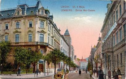 | Keywords: Lwów, ul. 3 maja.jpg uk Поштівка показує одну з цент альних вулиць Львова яка веде до міського па ку колишній Поєзуїтський Єзуїтський па к міський після І світової війни - па к імені Костюшка який тепе носить назву Івана Ф анка Кольо ове зоб аження ілюст ує буденну ситуацію Львова до Д угої світової війни вулиця 3 ая назва існувала вп одовж 1885-1941 пішоходи на т отуа ах та стафажне накладне зоб аження автомобіля pl Pocztówka przedstawia jedną z centralnych ulic Lwowa prowadzącą do parku miejskiego dawny park Pojezuicki Jezuicki miejski po I wojnie światowej park im Kościuszki który nosi obecnie nazwę Iwana Franki Kolorowa widokówka ilustruje życie codzienne we Lwowie przed drugą wojną światową ulica 3 Maja nazwa funkcjonowała od 1885 do 1941 r przejścia dla pieszych samochód sztafaż http //www lvivcenter org/en/uid/picture/ pictureid 380 PavloFriend 1916 Watermark Sichovykh Striltsiv Street Lviv PD-old |
