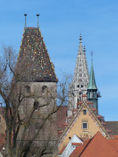 Keywords: münster ulm cathedral tower steeple spire artwork stonemason old monument places of interest metzgerturm hipped roof building brick colorful color light city view