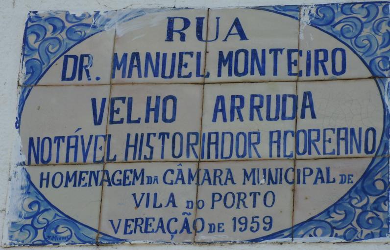 | Keywords: M m velho arruda 2.JPG en An azulejo panel commemorating the Dr Manuel Monteiro Velho Arruda Azorean historian by the municipal council of Vila do Porto in the civil parish of Vila do Porto municipality of Vila do Porto Azores Portugal pt Painel de azulejos indicativo da Rua Dr Manuel Monteiro Velho Arruda em Vila do Porto Ilha de Santa Maria Açores Portugal Own 2008-05 Carlos Luis M C da Cruz Vila Vila do Porto Azulejos in the Azores | ||||