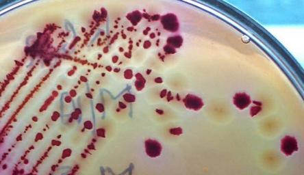 Keywords: Macconkey LF NLF.jpg en Lactose fermenting pink and non-lactose fermenting colonies seen on MacConkey's agar own Microrao JJMMC Davangere Karnataka India Petri dishes cultures J J M Medical College Bacterial growth medias and tests