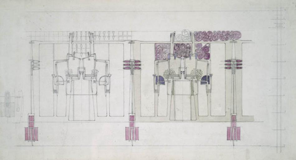 | Keywords: Mackintosh, Design for a decorative relief frieze, Willow Tea Rooms.jpg Photograph of Design for a decorative relief frieze Willow Tea Rooms Glasgow 1903 Pencil and watercolour on wove paper by Charles Rennie Mackintosh In the public domain Source http //www huntsearch gla ac uk/cgi-bin/foxweb/huntsearch/DetailedResults fwx collection all SearchTerm 41079 mdaCode GLAHA reqMethod Link Hunterian Museum Art Gallery Collections PD-art Willow Tearooms Drawings of friezes Artworks missing infobox template Hunterian Museum and Art Gallery |